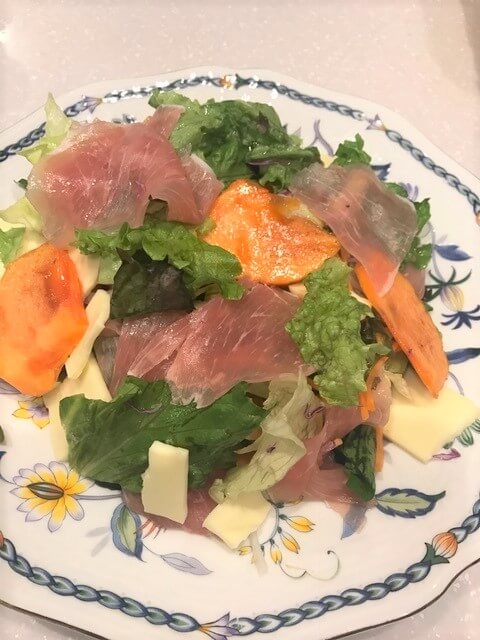 出来上がりの写真を見ると、柿と生ハムとレタスなどの野菜が入っていて、ドレッシングと混ぜているだけじゃないの?と思ったのがきっかけ。そして実際に作ってみると本当に簡単で、そして美味しいのです。