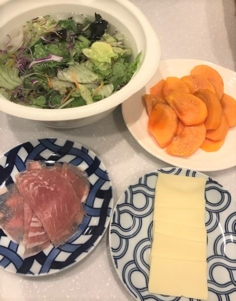 《今回紹介する簡単おつまみは「柿と生ハムのサラダ」》