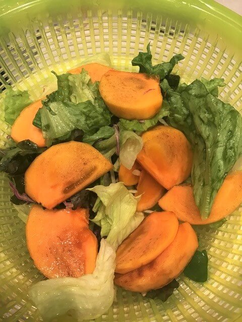 ※ザルでサラダミックスの水を切り、柿と混ぜておきます。