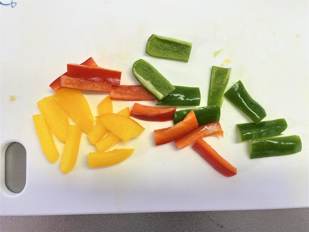 ・たまねぎはスライスすることでメインのパプリカとピーマンの食感がより味わえる