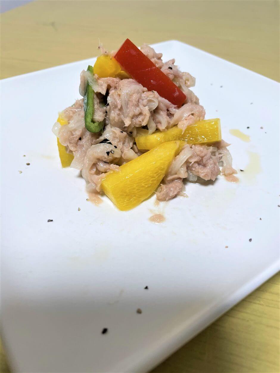 ③ボールにツナ缶1缶、炒めたたまねぎ、カットしたピーマンとパプリカを加えて味の素ひとつまみを加え、均等に和える